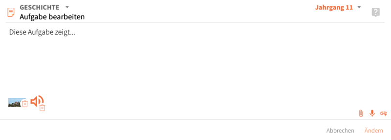- zum Hinzufügen entweder das Büroklammer-Symbol (Bild), das Mikrofon-Symbol (Sprachaufnahme) oder das Link-Symbol anklicken - siehe auch Aufgaben Dateien hinzufügen.