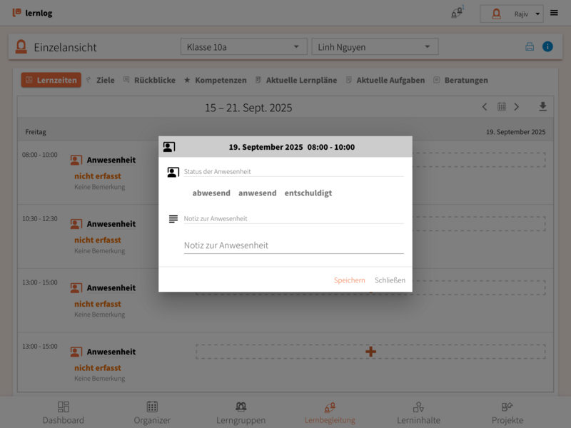 - Du kannst die Anwesenheit der*des Lernenden bearbeiten, indem du links neben der Lernzeit bzw. dem schulischen Termin auf "Anwesenheit" klickst.