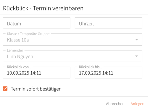 - Um einen Rückblick verbindlich zu vereinbaren, gibt es sowohl für die Lernbegleitung als auch für Lernende die Möglichkeit einen angesetzten Termin jeweils zu bestätigen.