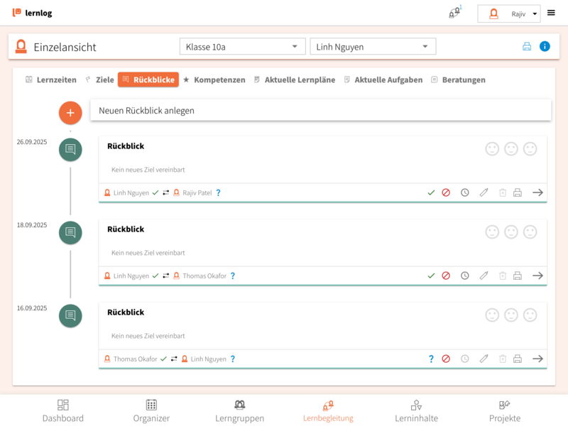 - In der Übersicht sind die bereits vorhandenen Rückblicke mit dem*der Lernenden chronologisch absteigend sortiert.