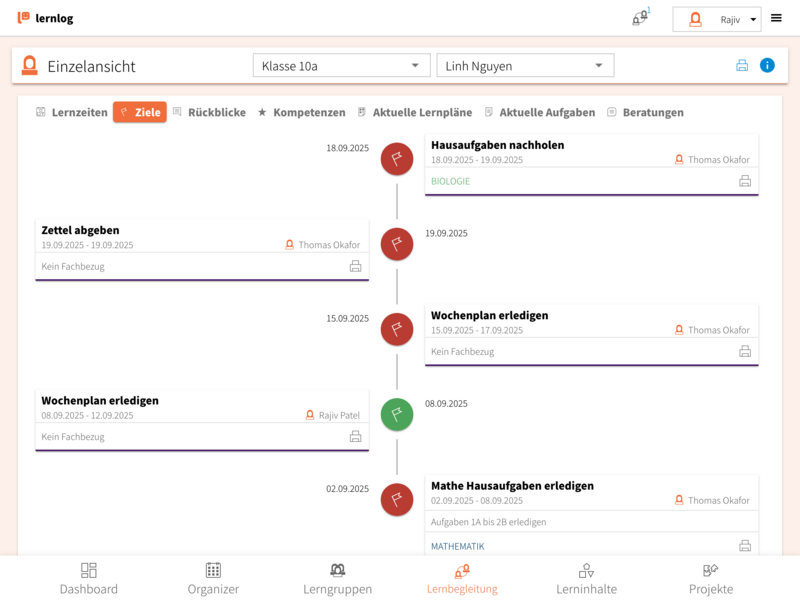 - In dieser Ansicht werden die individuellen Ziele des*der ausgewählten Lernenden in einem Zeitstrahl chronologisch als Karten angezeigt.