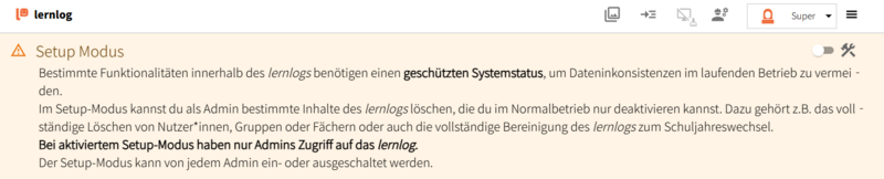- Du solltest lernlog immer dann in den Setup-Modus versetzen, wenn du datenintensive Funktionen ausführst, beispielsweise größere Nutzerdaten-Importe oder den jährlichen Schuljahreswechsel.