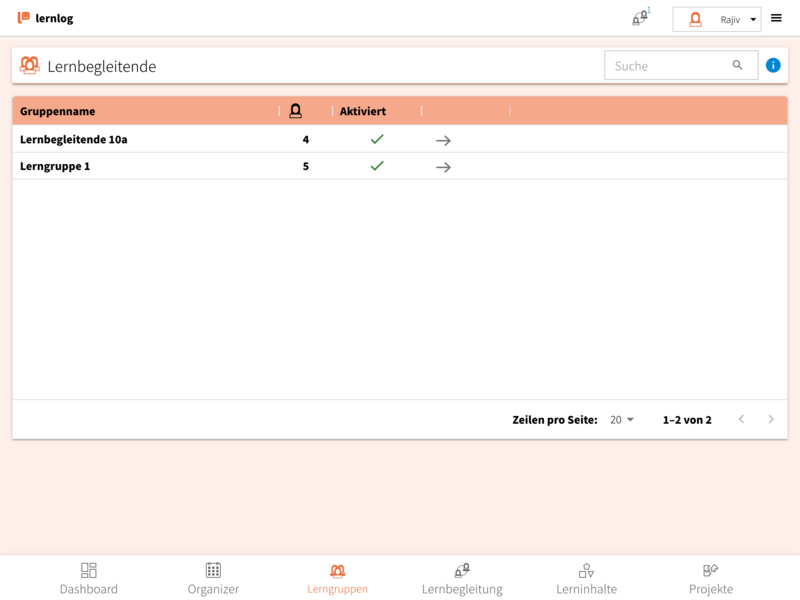 • Du hast auch die Möglichkeit über die Suchfunktion nach bestimmten Gruppen von Lernbegleitenden zu suchen und deaktivierte Gruppen auszublenden.