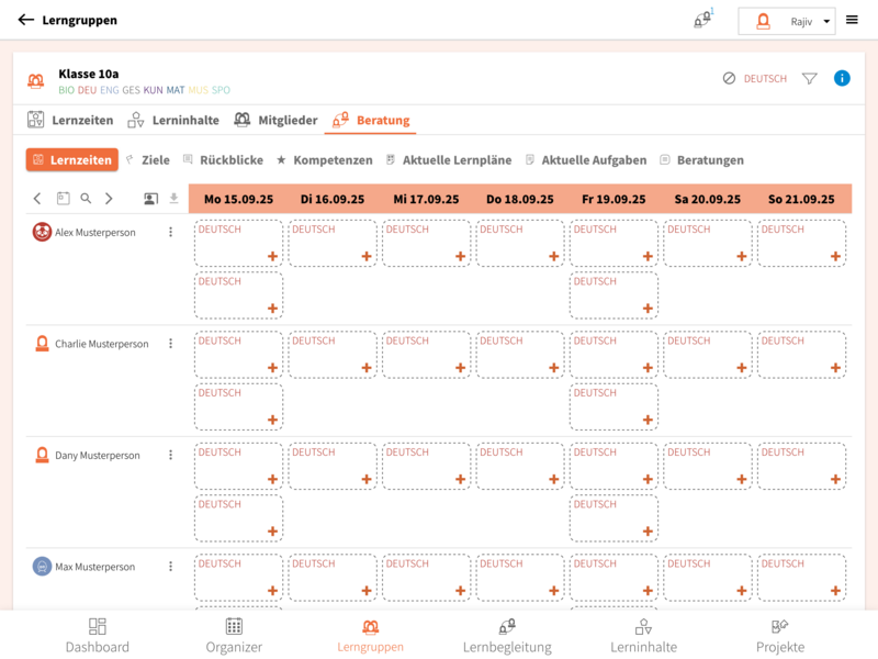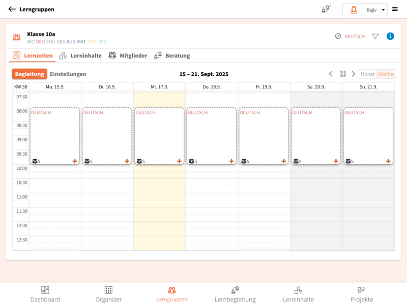 • Lernzeiten: Hier findest du die Lernzeiten der ausgewählten Lerngruppe.