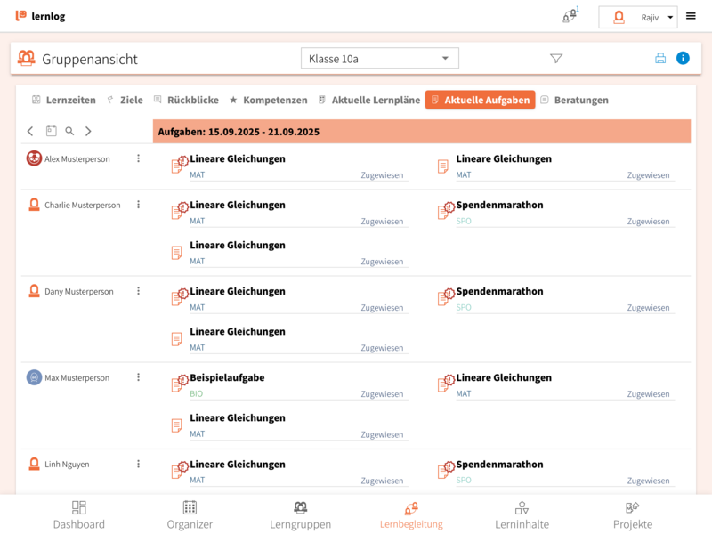 - In dieser Übersicht werden dir die aktuellen "freien Aufgaben" aller Lernenden der Gruppe angezeigt.