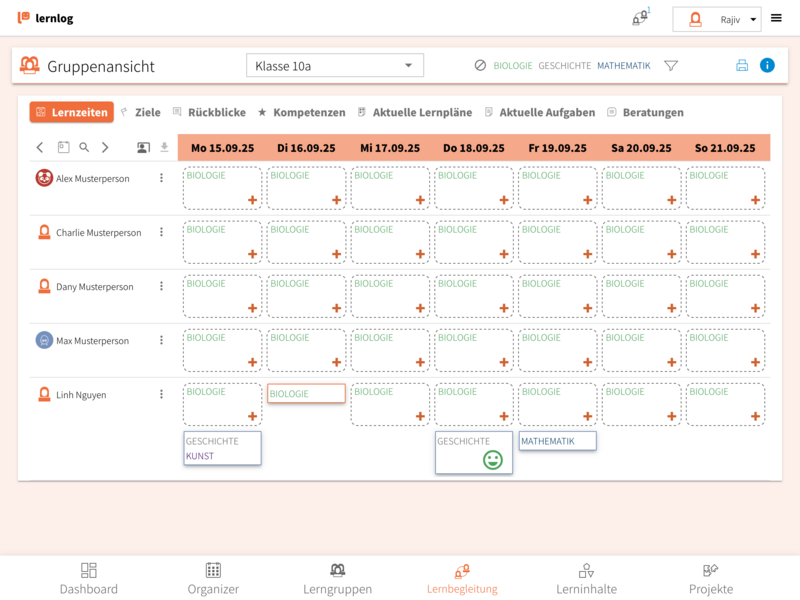 - Nachdem du eine Gruppe ausgewählt hast, kannst du unter dem Reiter "Lernzeiten" die aktuellen Lernzeiten und Schüler*innen-Lernzeiten (schulischen Termine) aller Lernenden betrachten.