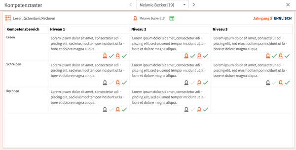 • Kompetenzraster: Tabellarische Darstellung beliebig vieler Kompetenzbereiche.