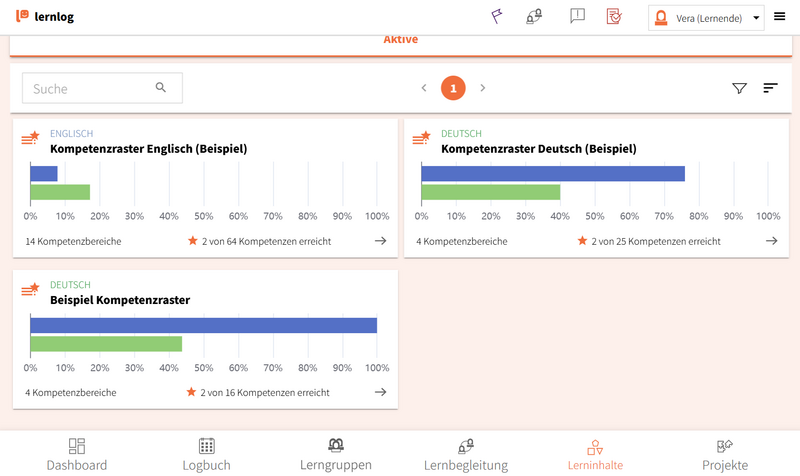 • Ein Kompetenzraster ergänzt den Lernfortschritt, gemessen in Form erledigter Lernpläne und deren Aufgaben, durch sichtbaren Gewinn von Kompetenzen von Lernenden.