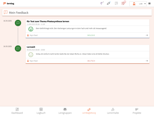 • Unter "Mein Feedback" findest du das Feedback, welches dir deine Lernbegleitung zu Lernzeiten oder Schüler*innen-Lernzeiten gegeben hat, in einer chronologischen Reihenfolge.