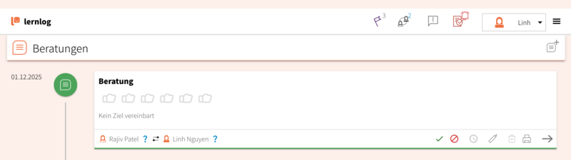 • In den einzelnen Karten zu den Beratungen erhältst du einen Überblick über deine Bewertungen zu den gestellten Standard-Fragen und deinen Zielen.