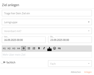 • Fachlich: Wenn du hier den Haken setzt, kannst du ein Fach auswählen, dem du dein Ziel zuordnen möchtest.