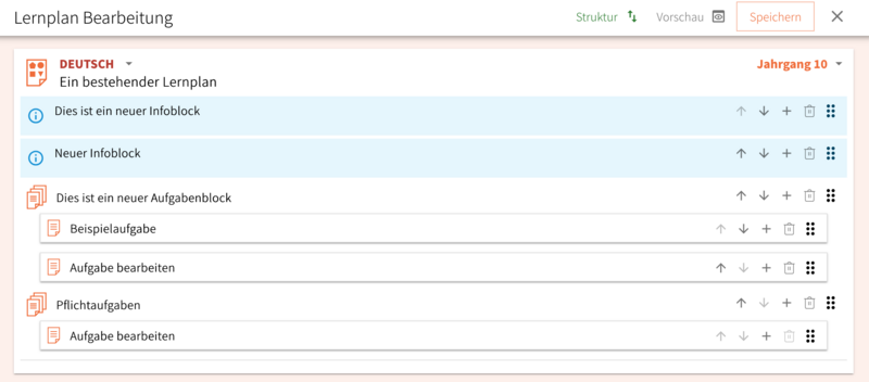 - Du kannst außerdem den bestehenden Info- und Aufgabenblöcken über das "Struktur-Symbol" neue hinzufügen, diese neu anordnen oder löschen.
