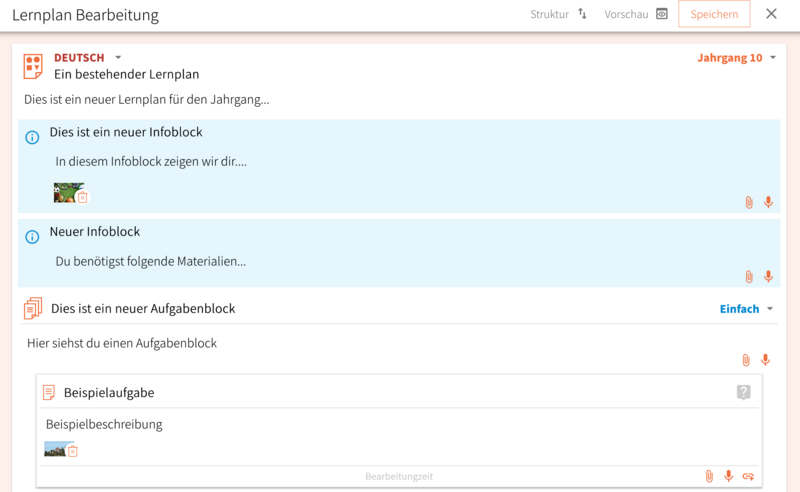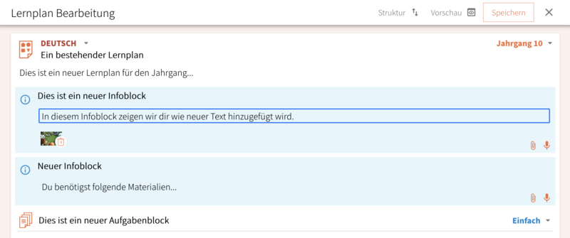 - Die Info- und Aufgabenblöcke des Lernplans kannst du bearbeiten, indem du im Bearbeitungsmodus des Lernplans in die entsprechenden Felder klickst und den Text bearbeitest. Du kannst: