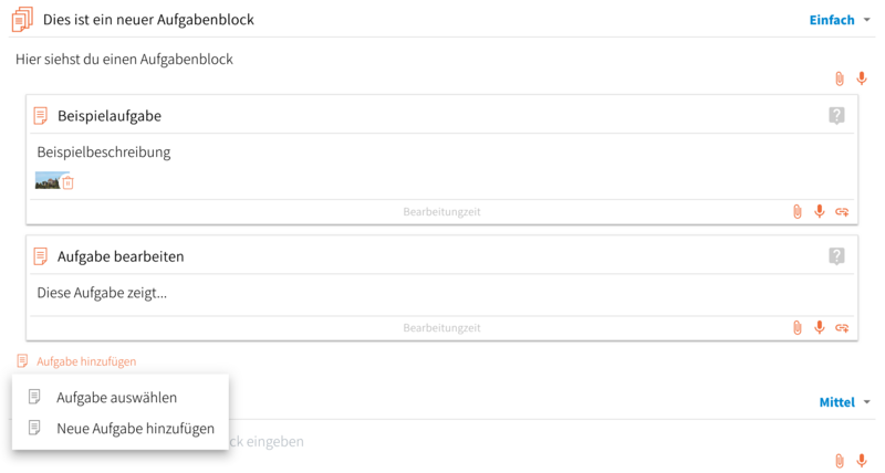 - Du kannst einem Aufgabenblock über "Aufgabe hinzufügen" eine "neue Aufgabe hinzufügen" oder eine bereits erstellte Aufgabe "auswählen".