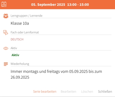 • Das bedeutet: Der aktuelle Zeitpunkt muss vor dem Startzeitpunkt der Lernzeit liegen. Dies gilt auch für einzelne Lernzeiten aus Lernzeitserien.