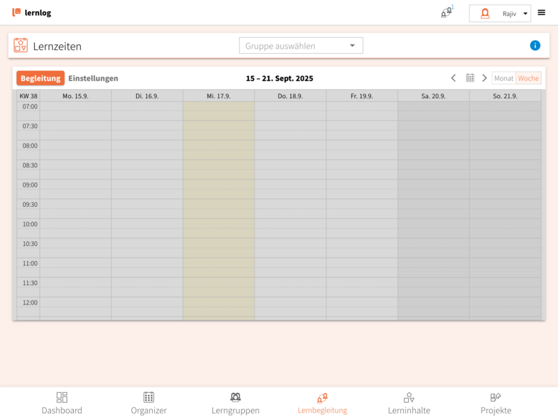 - Dieser Bereich gibt Lernbegleitenden die Möglichkeit, Lernzeiten bezogen auf eine Lerngruppe zu verwalten. Die Lernbegleitenden können Anwesenheiten kontrollieren, Feedback zu einzelnen Lernzeiten geben und Änderungen an den Einstellungen einer Lernzeit oder Lernzeitserie vornehmen.