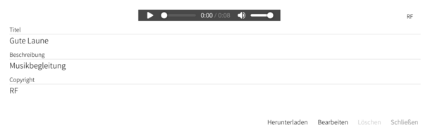 - In der Detailansicht hast du die Möglichkeit, über den Audio-Player links die Audio-Datei anzuhören. Du kannst dort das Abspielen starten, über den Regler in der Datei vor- und zurückgehen und über den Lautstärkeregler die Lautstärke einstellen. Die Darstellung des Players kann je nach Browser variieren.