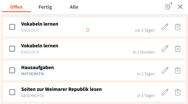 • In der Übersicht siehst du eine Liste mit allen deinen To-Dos. Dort siehst du, zu welchem Fach oder Lernformat das To-Do gehört, wie es heißt und bis wann du es spätestens erledigt haben musst.