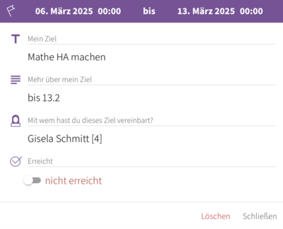 • Du kannst über das Logbuch dein Ziel als erreicht markieren. Dazu verwendest du den Schalter in der Detail-Ansicht.