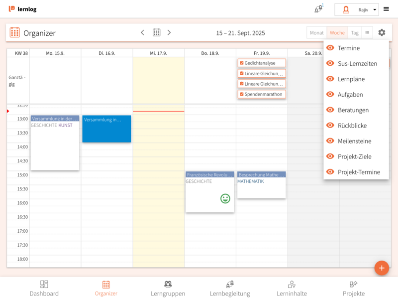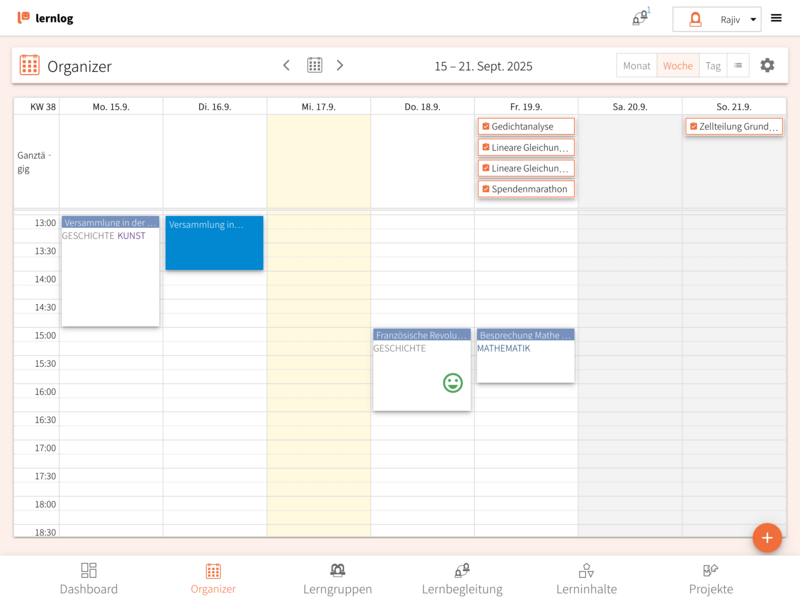 • Der Organizer stellt alle aktuellen Verpflichtungen von Lernbegleitenden in Kalenderform dar.