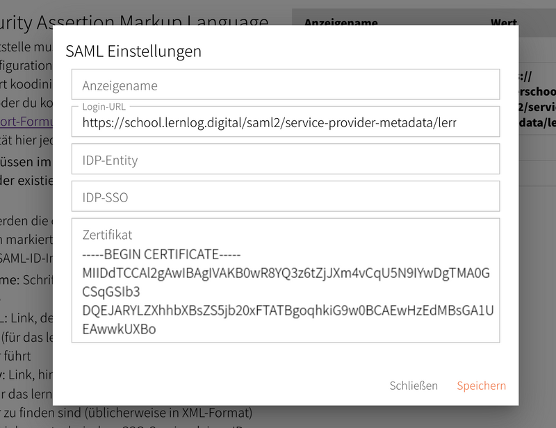 Die SAML-Schnittstelle muss zunächst konfiguriert und zur Anwendung der Konfiguration muss die lernlog-Instanz neugestartet werden. Den Neustart koordinierst du bitte mit deinem Hoster/Anbieter von lernlog, oder du kontaktierst den Support von lernlog über das Online-Support-Formular.