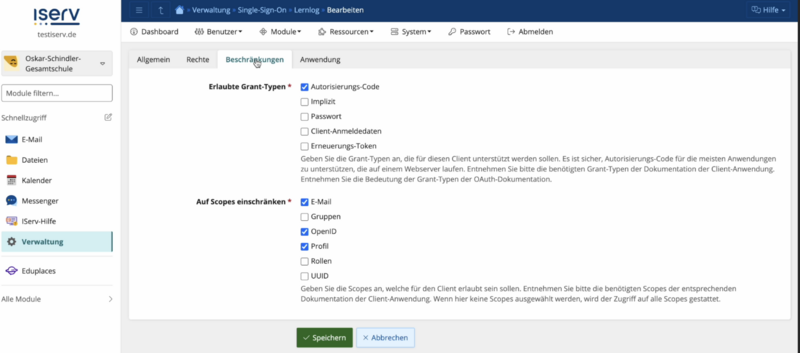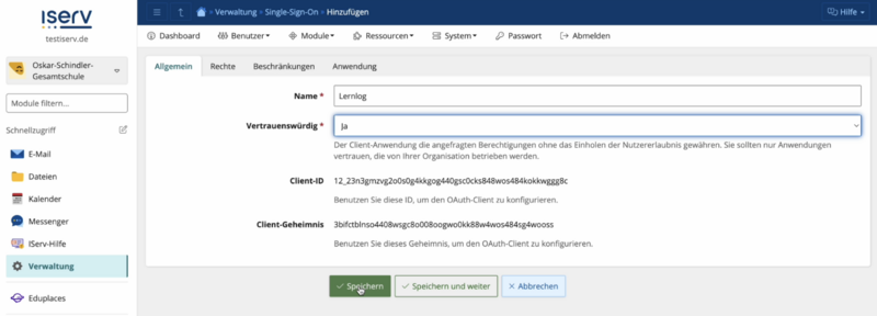 - Client-Secret: Kopiere den Wert aus der Konfiguration in deiner IServ-Instanz (Feld Client-Geheimnis) und füge ihn im Formular ein.
