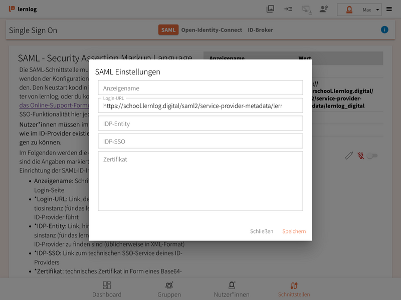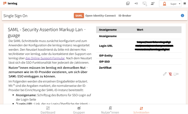 - Nachdem du dich in lernlog als Admin angemeldet hast, wechsle nun in der Navigation unter "Schnittstellen" zum Menüpunkt "Single Sign-On".