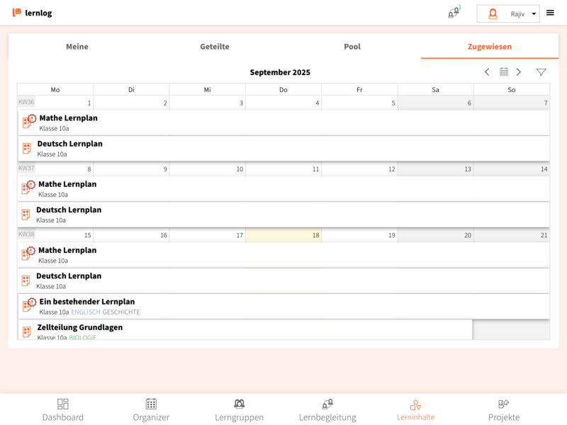 - Zugewiesene Lernpläne sind die Lernpläne, die du oder andere Lernbegleitende einer Gruppe von Lernenden zur Bearbeitung zugewiesen haben. Die Zuweisungen werden im Kalender dargestellt.